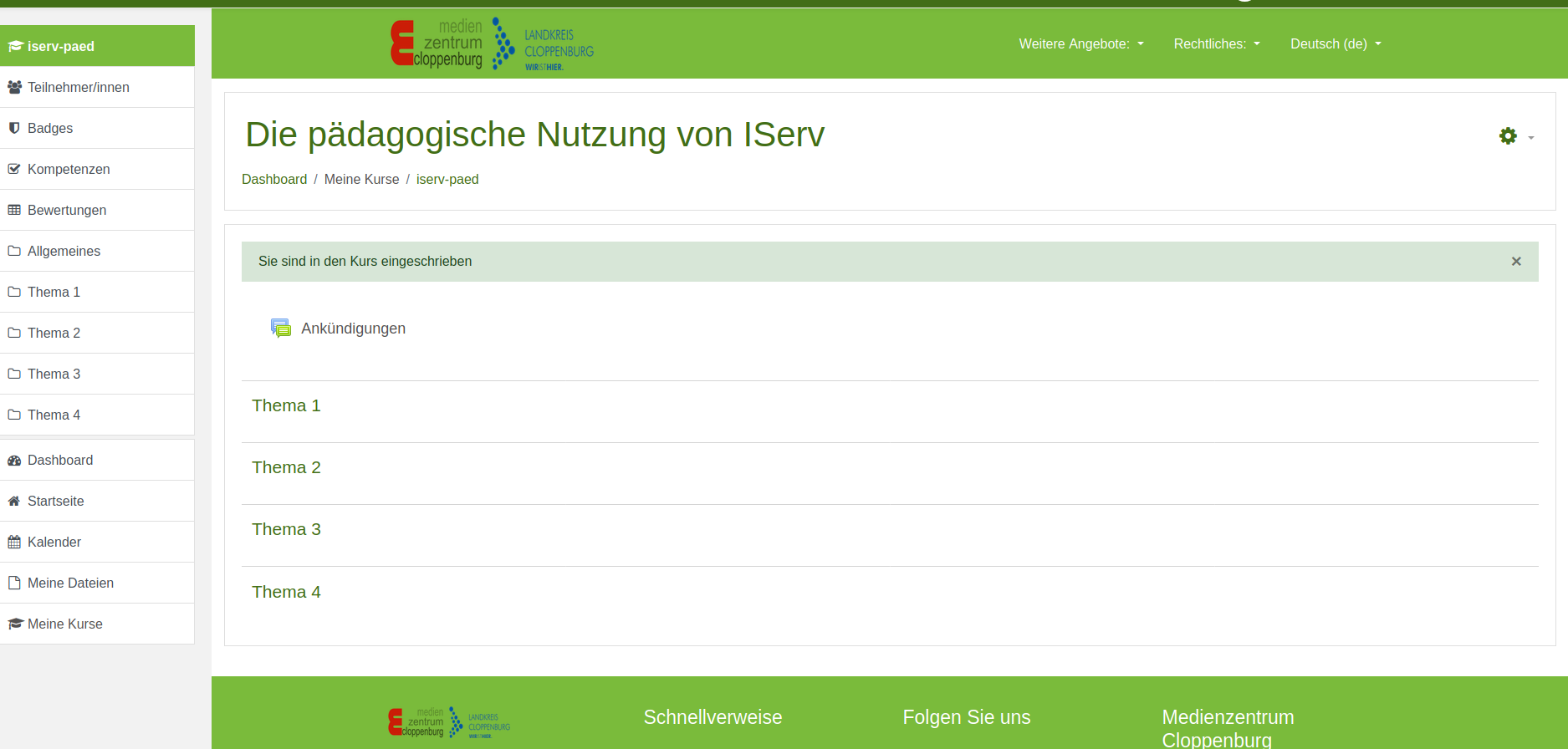 Das Hosting des Kurses erfolgt auf Hardware des Landkreises Cloppenburg direkt im Medienzentrum Cloppenburg. Ihre Daten werden nicht an Dritte weitergegeben.