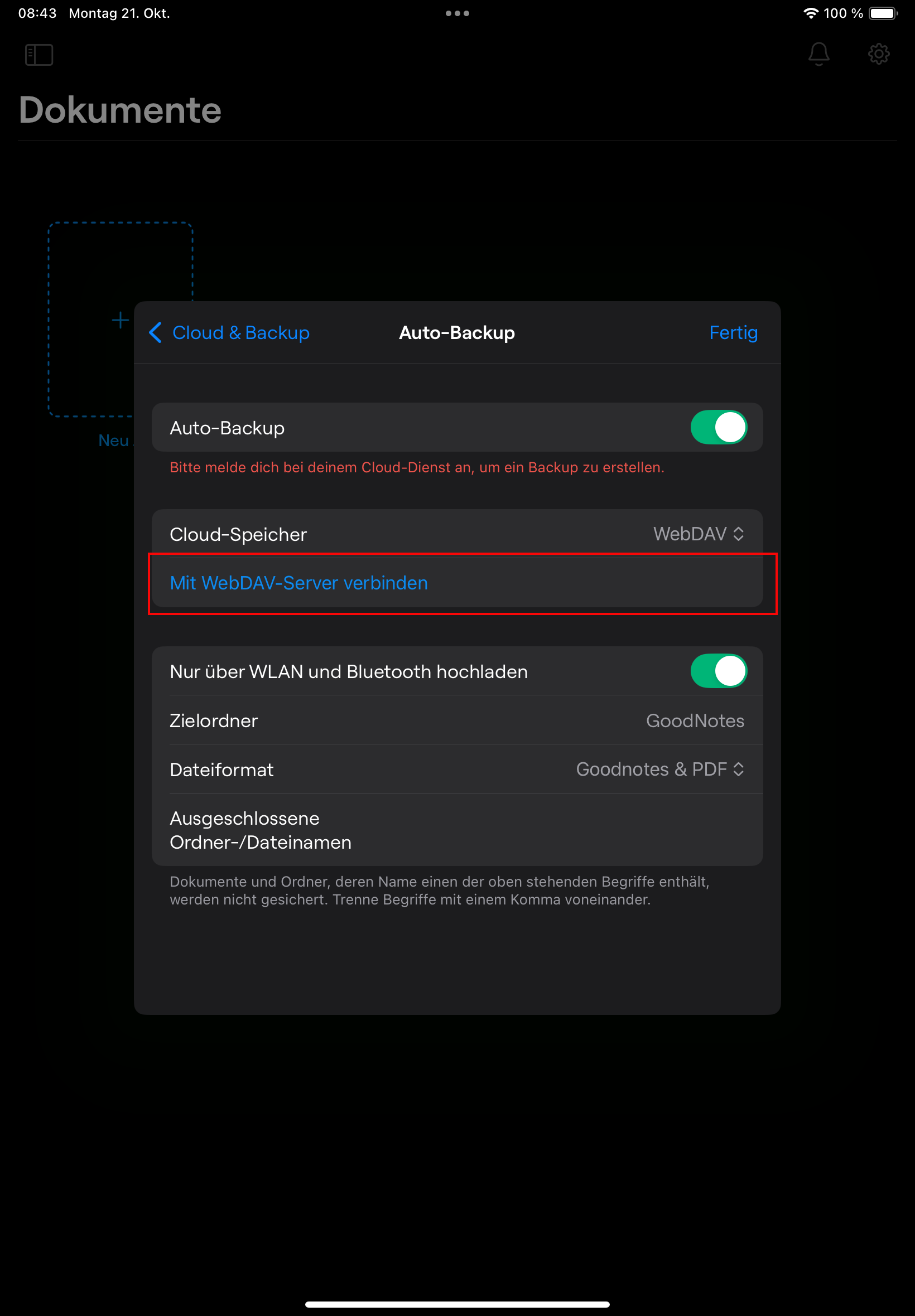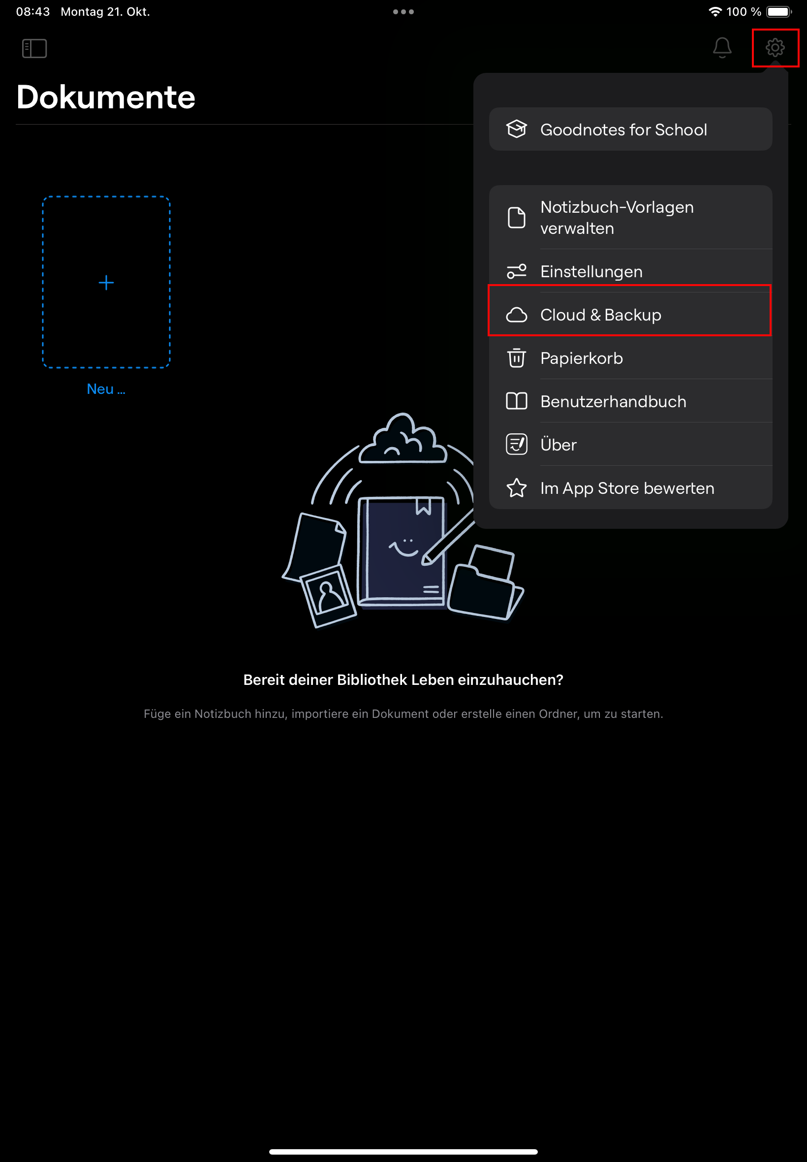 Öffne Goodnotes und gehe in die Einstellungen (Zahnradsymbol), wähle den Menupunkt „Cloud & Backup“: