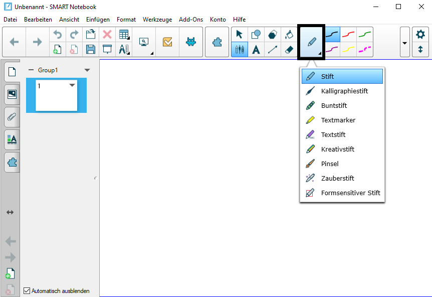 Die erste große Funktionsgruppe sind Stifte, die verschiedene optische Effekte anbieten. Sie eignen sich primär für kreatives Arbeiten und dafür, Arbeitsergebnisse optisch ansprechender zu gestalten. Sie erweitert die SMART-Notebooksoftware um Funktionen, die an der klassischen Kreidetafel nicht so ohne Weiteres möglich sind.