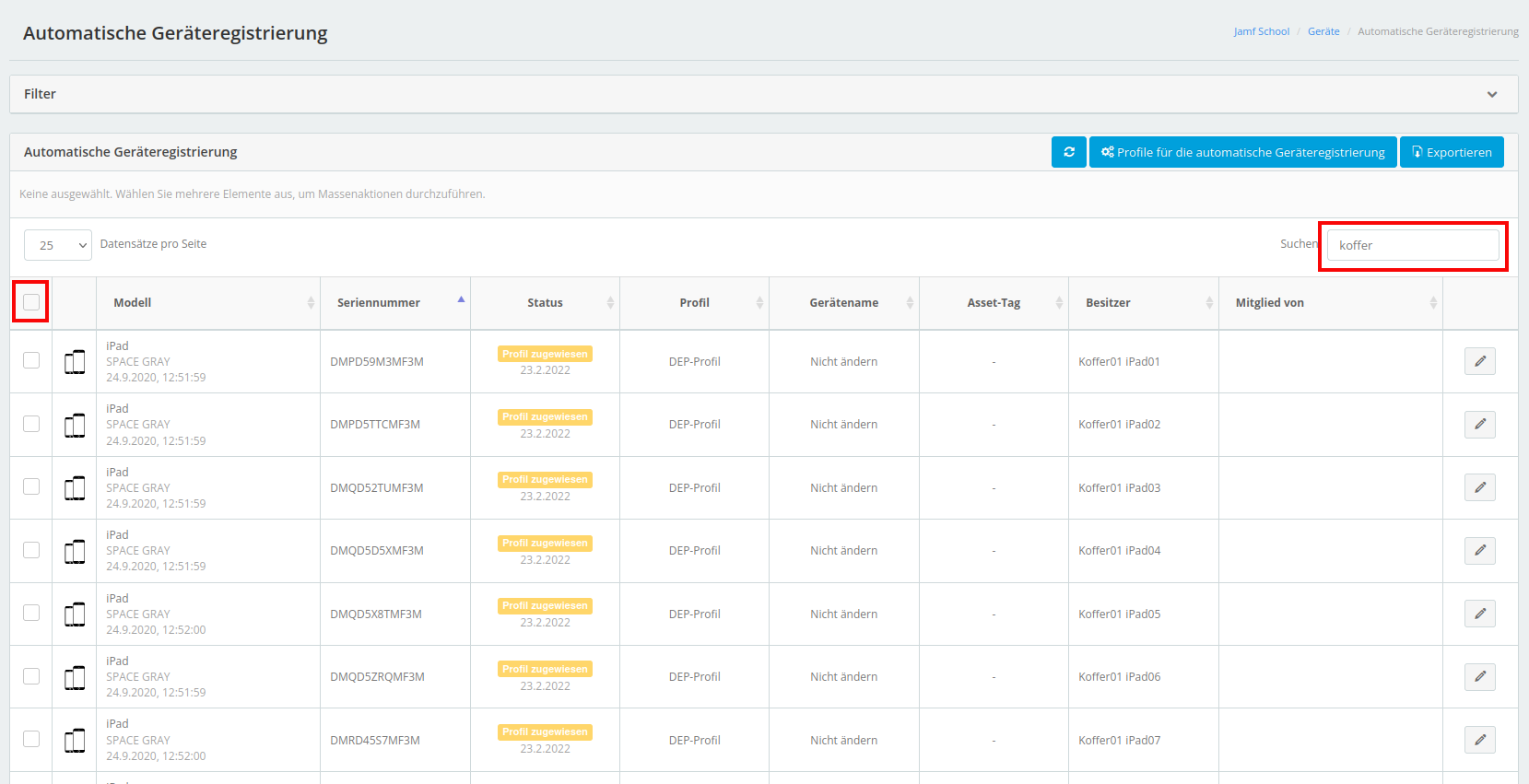 Filtern Sie nun nach der eben erstellten Gerätegruppe und wählen Sie die Geräte durch setzen des Hakens links aus: