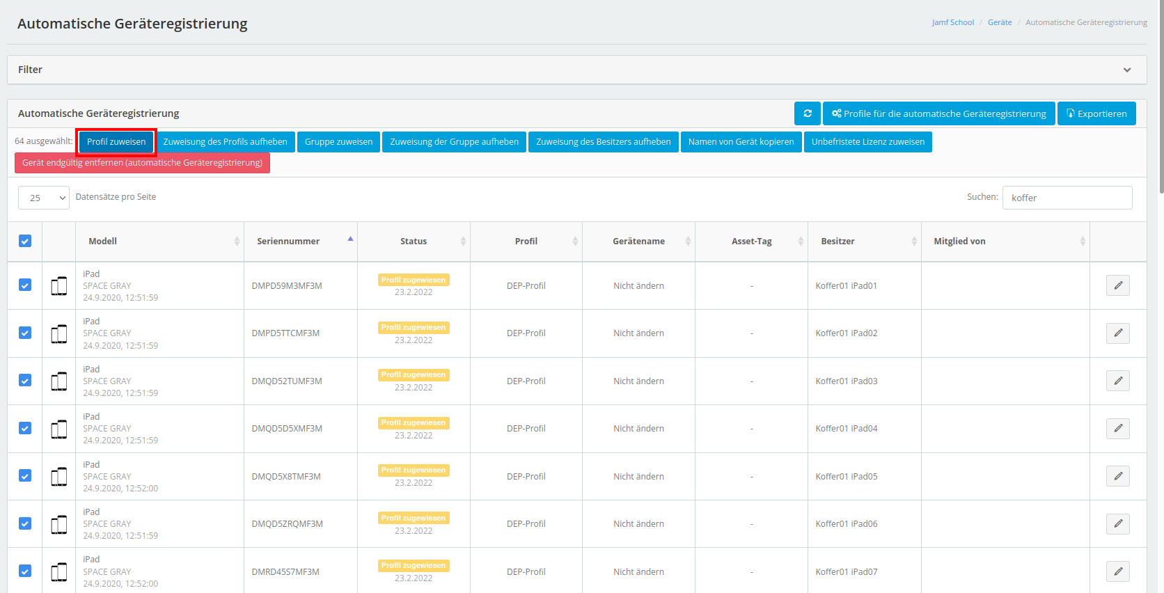 - Das gerade erstellte DEP-Profil allen Geräten der eben erstellten Gerätegruppe zuweisen