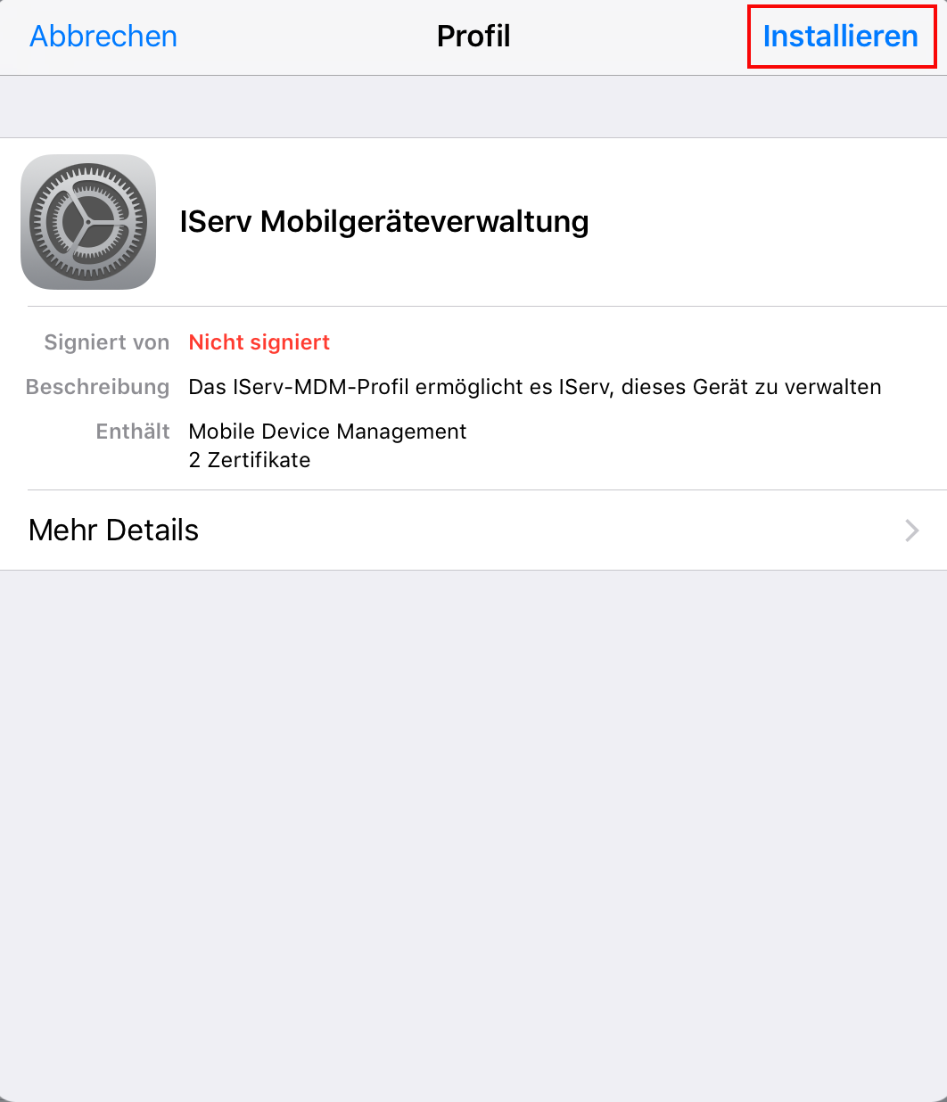 Einstellungen ⇒ Allgemein ⇒ Geräteverwaltung ⇒ IServ Mobilgeräteverwaltung