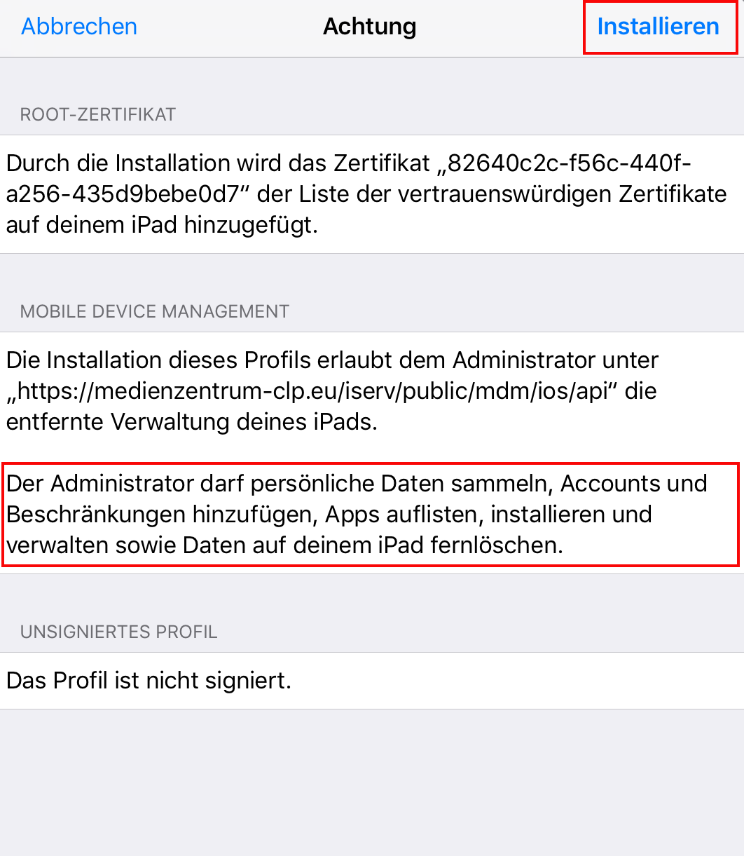 Lesen Sie sich diese Warnhinweise gut durch. Apple unterscheidet dabei nicht zwischen vollständig verwalteten Geräten und offenen Privatgeräten. Entsprechend „mächtig“ ist die Warnung.