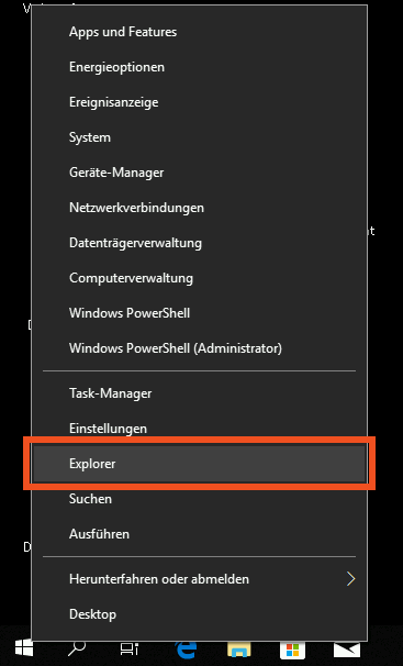 Oder Sie können den Explorer über einen Rechtsklick auf das Windowssymbol unten links aufrufen:
