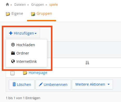 Über Art der Gruppen und die Zuweisung von Nutzern zu ihnen entscheidet der Administrator. Über eine Schaltfläche können Sie Dateien von Ihrem PC zu Hause auf den IServ hochladen. Dazu müssen Sie zunächst auf den gewünschten Gruppenordner - hier „Spiele“ - klicken.