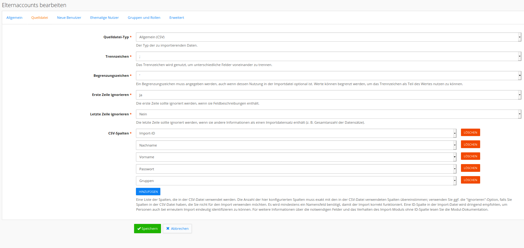 Die Zuordnung der Eltern zu dem Kind erfolgt über die Kind-ID. Eine eigene Import-ID für die Elternaccounts ist nicht erforderlich. Diese wird beim Anlegen automatisch erzeugt.