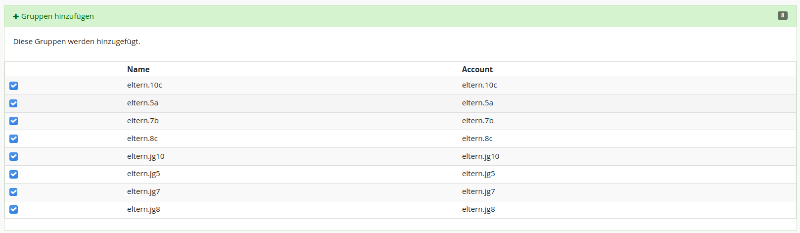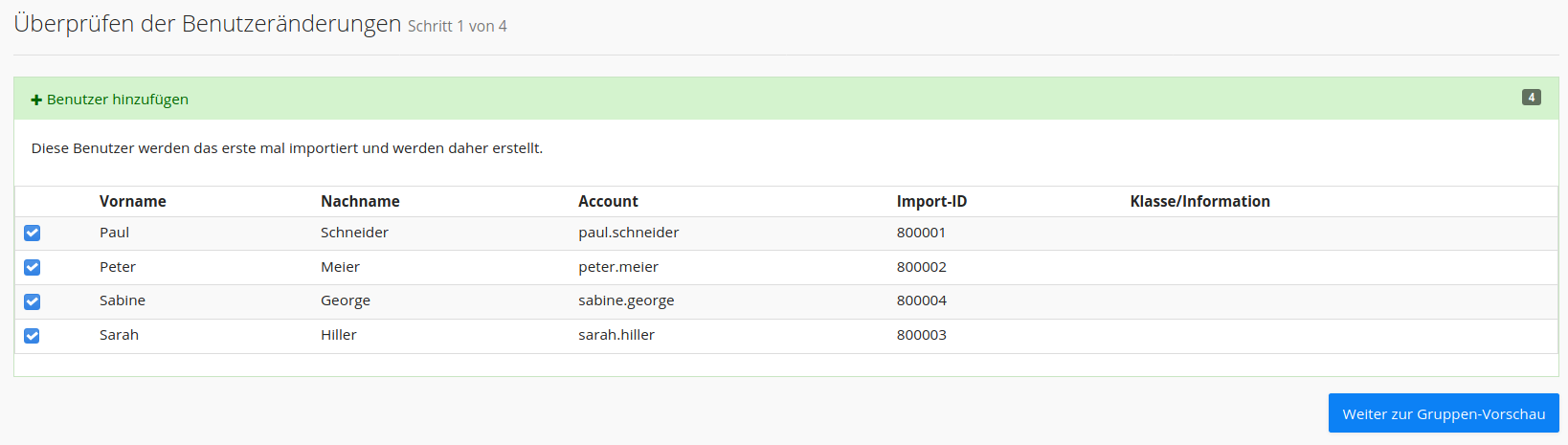 Durch einen Klick auf die blaue Schaltfläche ganz unten rechts („Weiter zur Gruppenvorschau“) zeigt Ihnen IServ jetzt, was sich im Gruppenbereich durch den Import verändert - auch das ist bisher lediglich eine Vorschau zur Kontrolle: