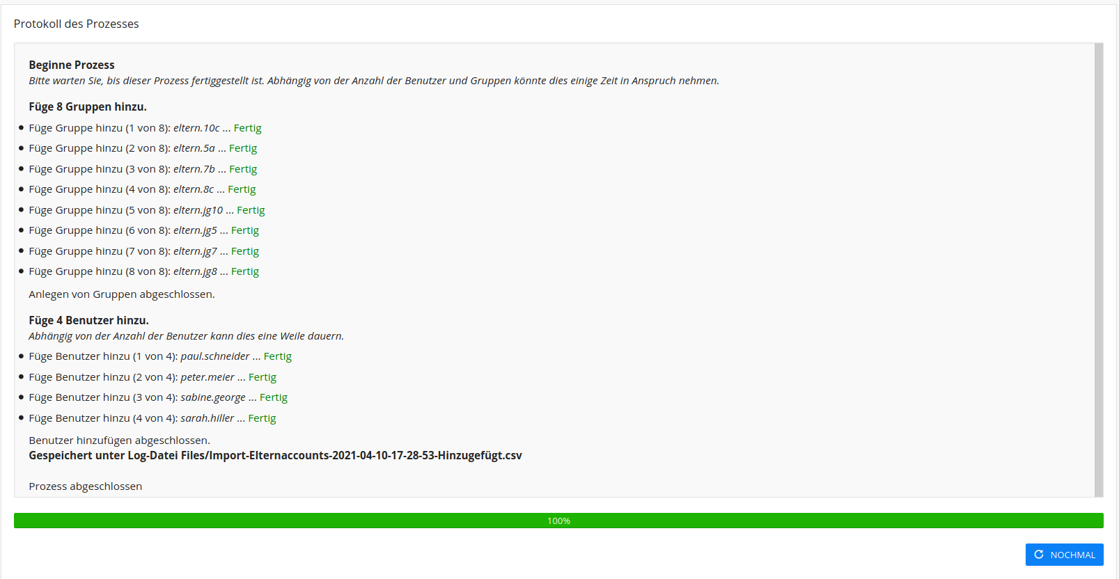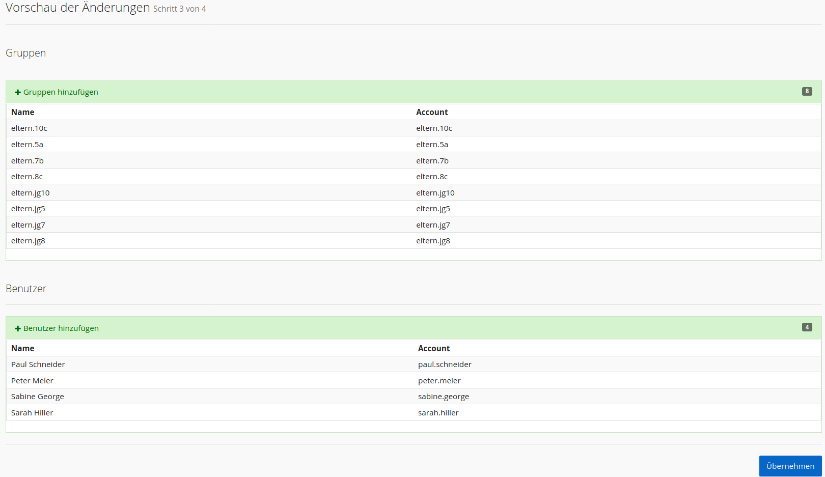 Nach einem Klick auf „Vorschau der Änderungen“ zeigt Ihnen IServ an, welche Nutzeraccounts für Eltern angelegt werden - das ist bisher nur eine Vorschau zur Kontrolle: