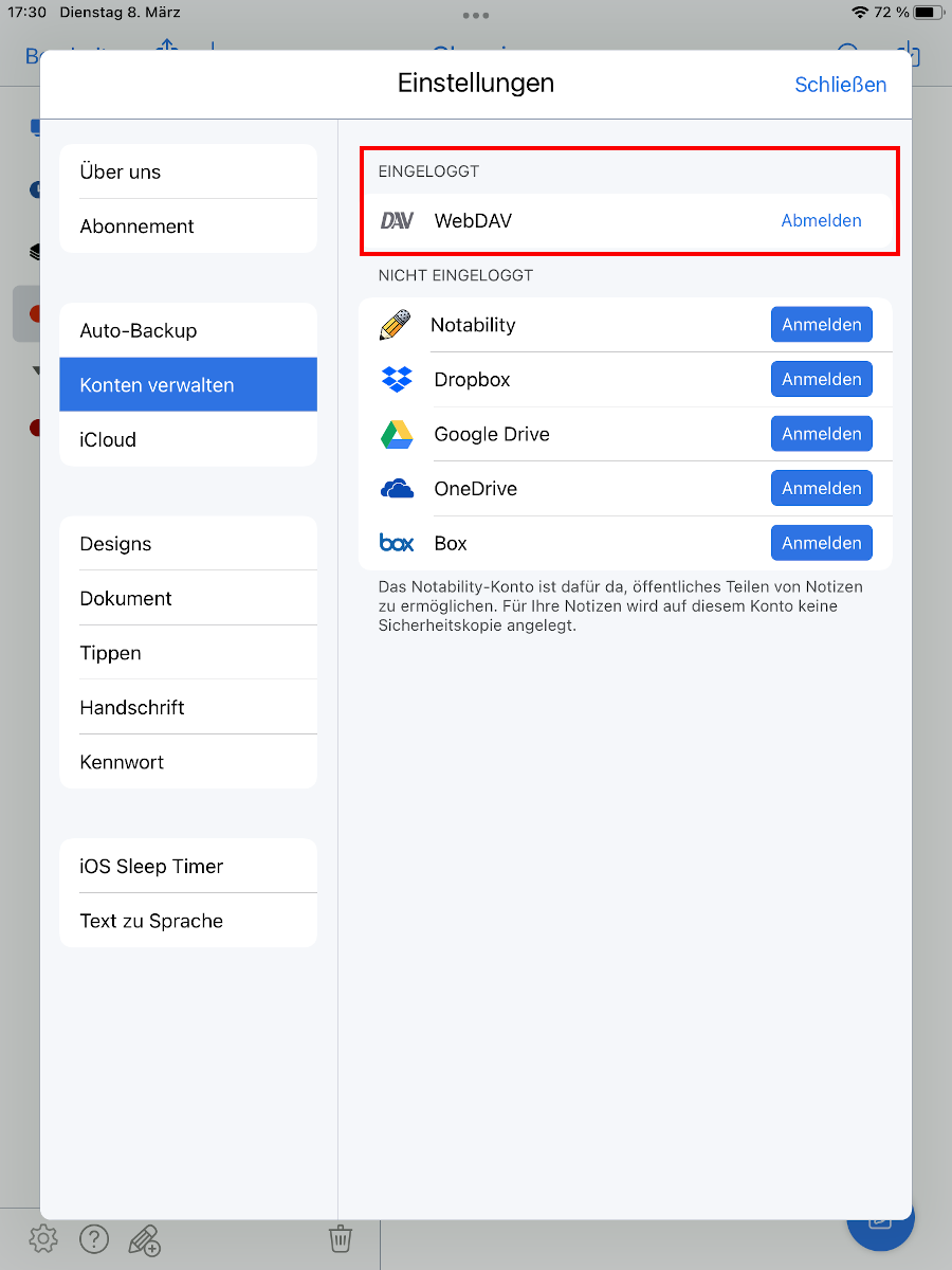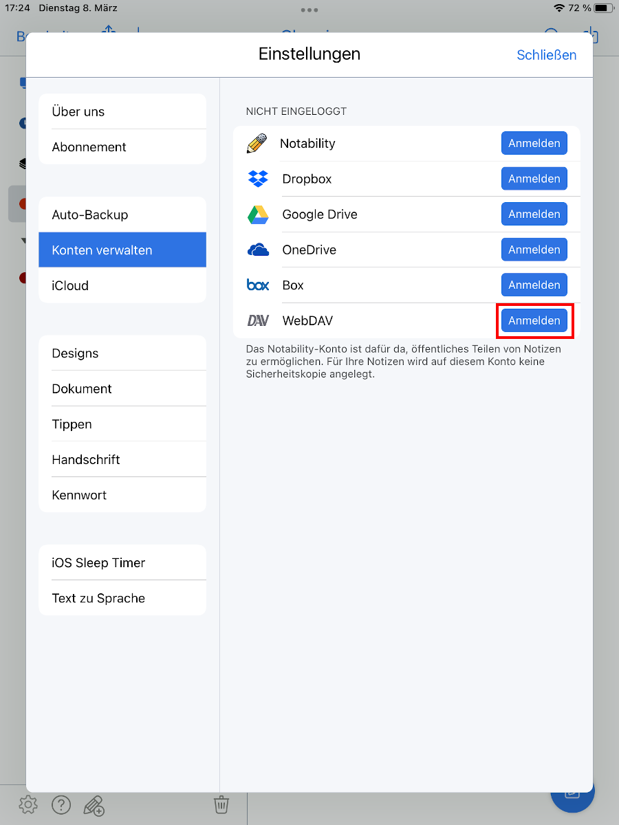 Wählen Sie unter „Konten verwalten“ „anmelden“ bei „WebDAV“ aus: