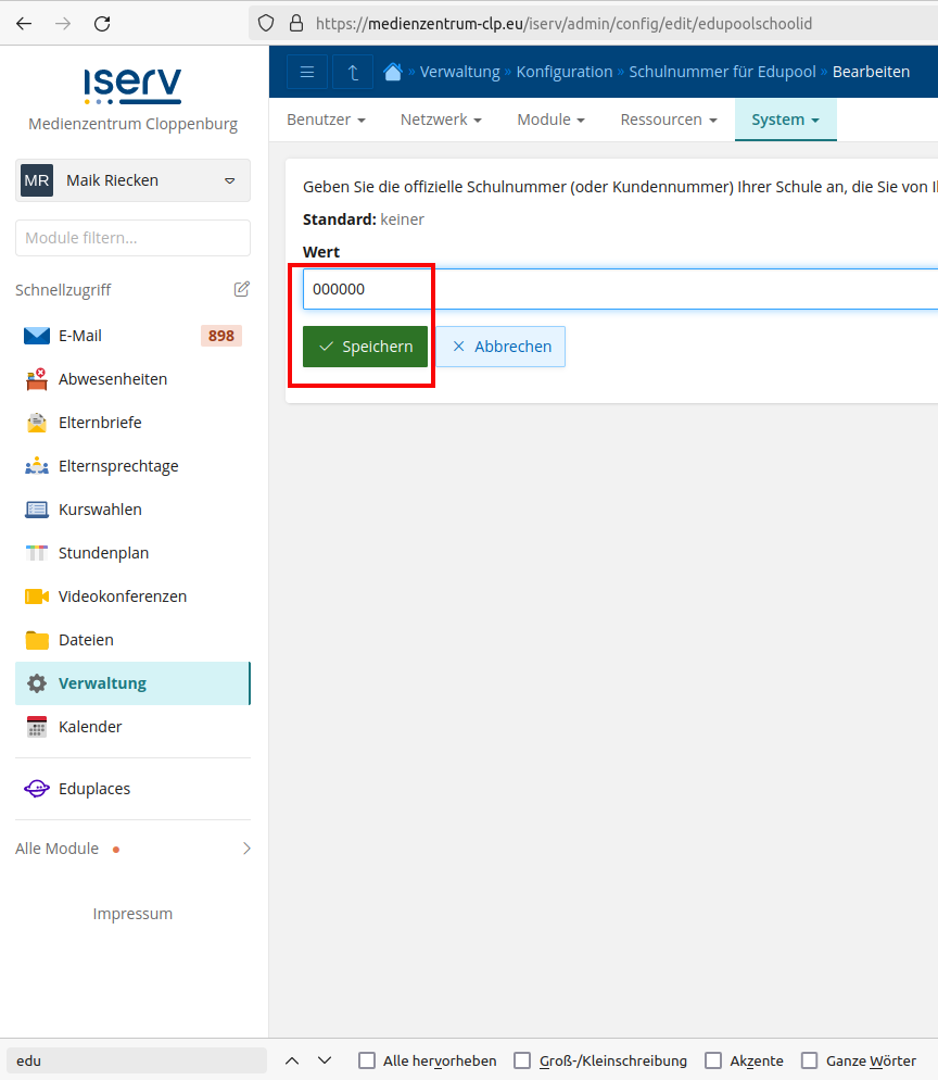 Als Schulnummer konfigurieren Sie bitte Ihre Schulkundennummer des Medienzentrums: