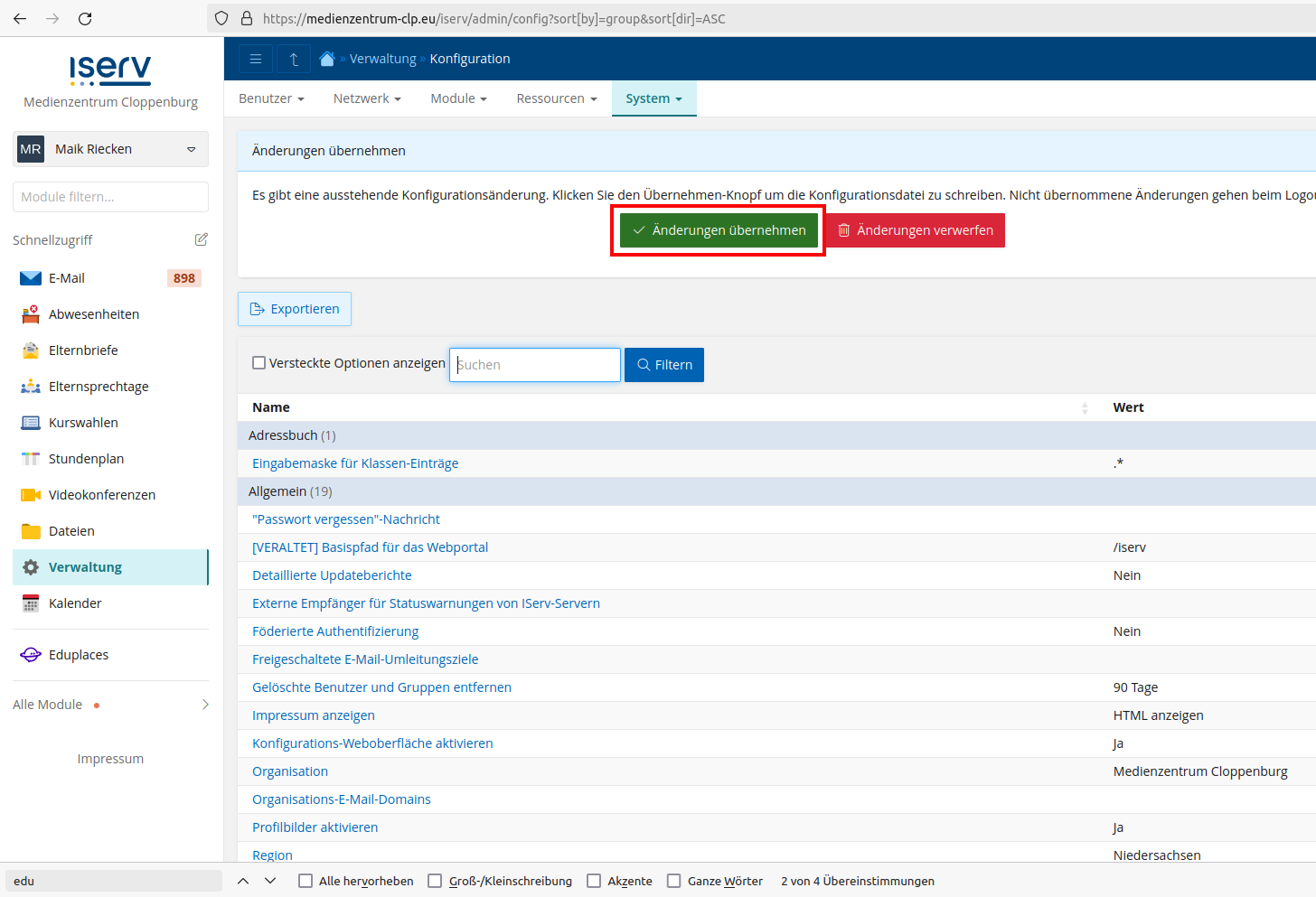Mit diesen Daten können Sie nun die Verbindung im IServ vornehmen. Gehen Sie dazu im Verwaltungsbereich auf „Konfiguration ⇒ Pakete“. Falls die Pakete