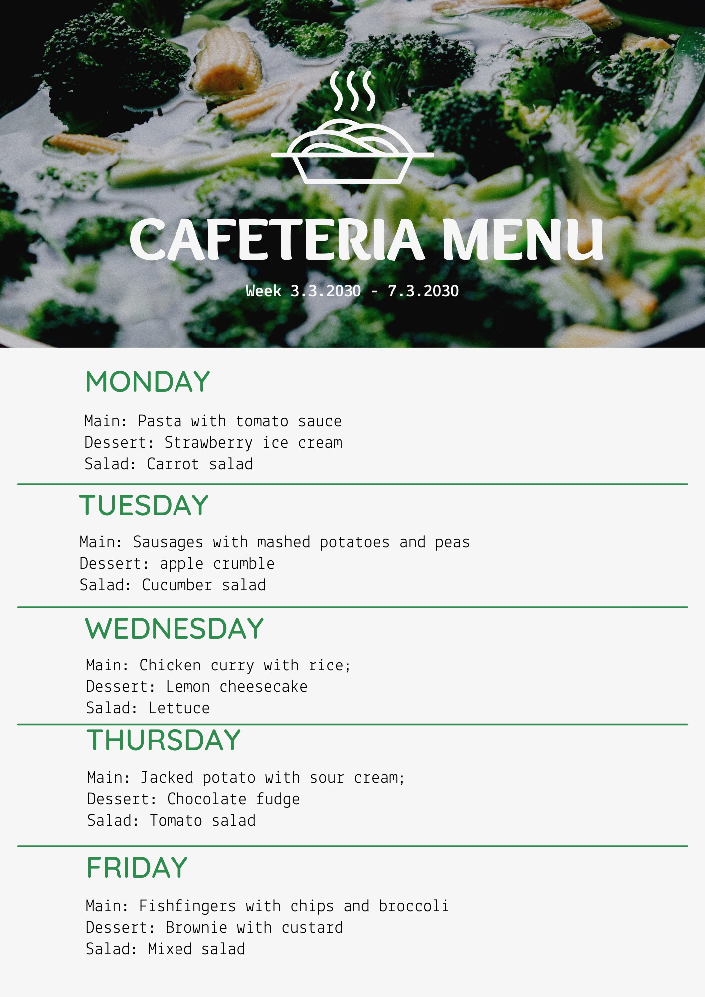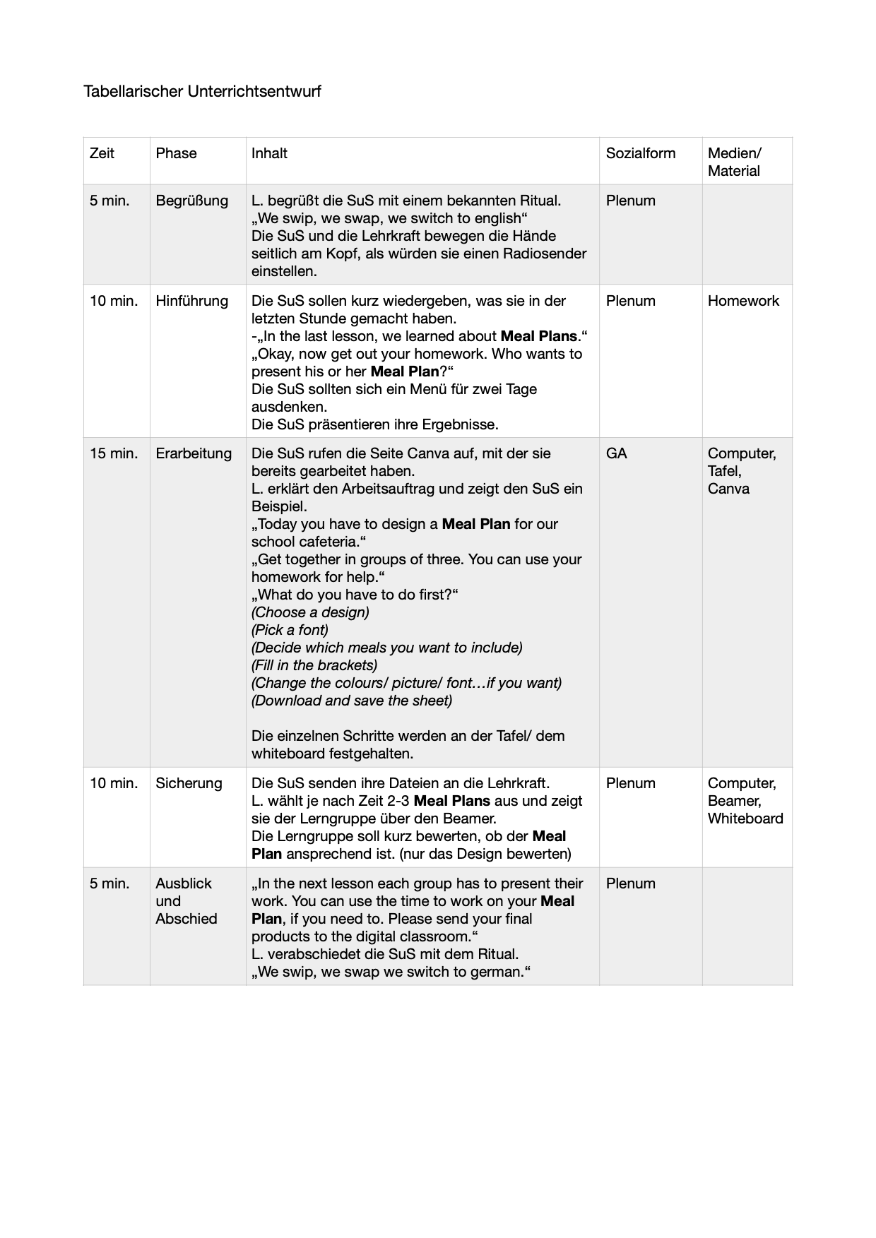 | Diese Unterrichtseinheit | Mithilfe des Tools „Canva“ und ihrer Hausaufgabe erstellen die SuS in Kleingruppen einen „Meal Plan“ für ihre Schulmensa. |