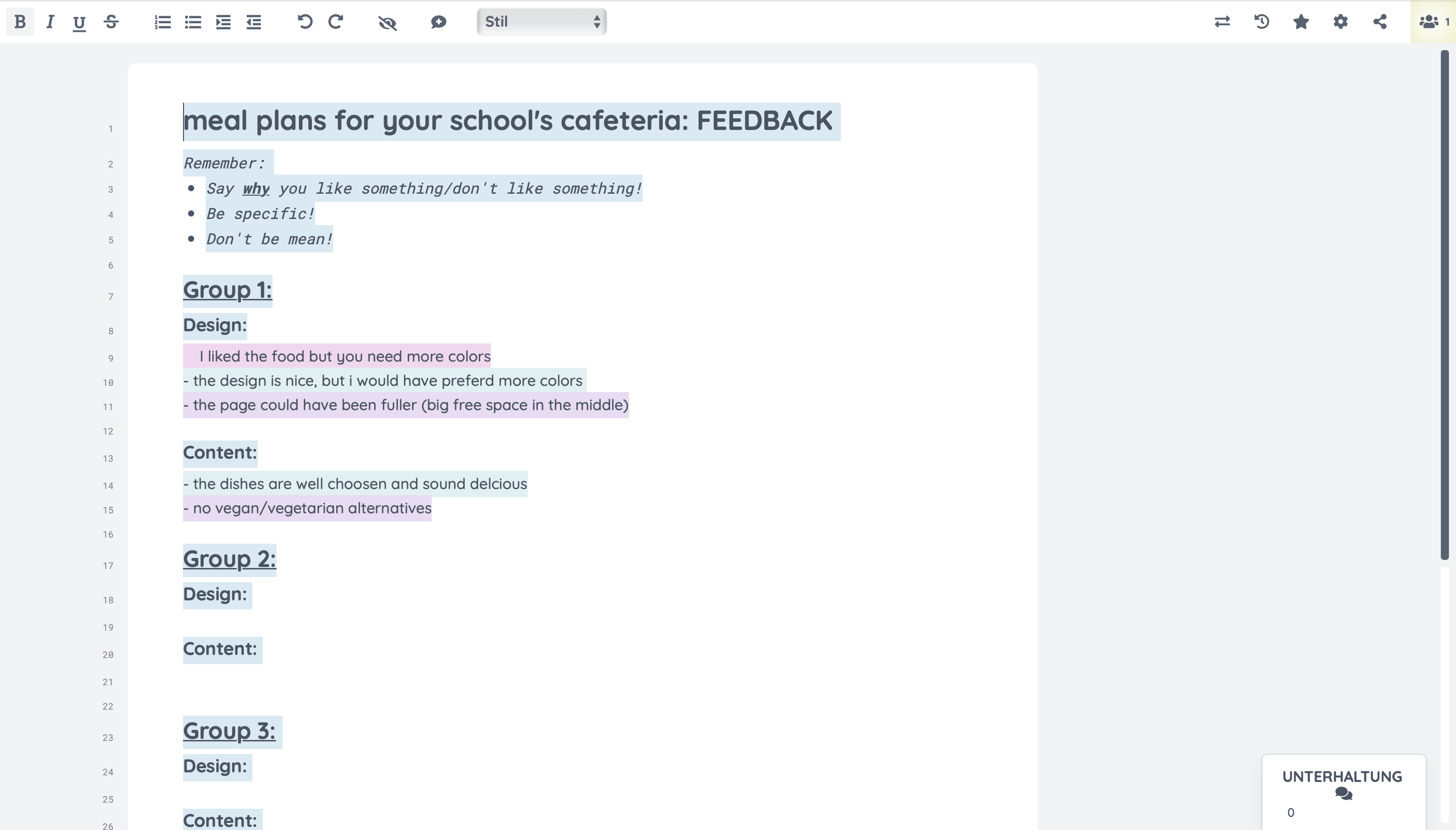 | Ablauf | Nach der Begrüßung und dem Einstiegsritual finden sich die SuS in den selbstständig eingeteilten Kleingruppen zusammen und öffnen Canva. Sie bearbeiten die folgende Aufgabenstellung unter Zuhilfenahme ihrer Hausaufgabe: 1. Erstellt mithilfe von Canva und euren vorbereiteten Gerichten einen (fiktiven) Meal Plan (Flyer) für die Schulmensa. Die SuS sind bei der Erstellung des Meal Plans sowohl hinsichtlich der inhaltlichen als auch der kreativen Gestaltung frei. Bei Fragen und Problemen steht ihnen die Lehrkraft zur Seite. Sind die SuS mit der Aufgabe fertig, laden sie ihren Flyer als png-Datei herunter und übermitteln ihn via E-Mail an die Lehrkraft. In der Sicherungsphase werden die Gruppen-Ergebnisse im Sinne der Sprechkompetenz „Zusammenhängendes Sprechen“ mündlich und unter folgender Aufgabenstellung präsentiert: 2. Stellt euren Mitschülern euren Meal Plan vor. Für welche Gerichte habt ihr euch entschieden und warum? Im Anschluss an jede Präsentation erhalten die übrigen SuS Zeit, über ein Etherpad Rückmeldungen unter Berücksichtigung der etablierten Feedback-Regelungen zu geben. Das Feedback kann sowohl inhaltlich (insbesondere bezogen auf (Rechtschreibung-)Fehler) als auch im Hinblick auf das Design erfolgen. Die Aufgabenstellung hierzu lautet: 3. Gebt euren Mitschülern über das Etherpad ein kurzes Feedback zu ihren Meal Plans. Konzentriert euch vor allem auf den Inhalt und das Design. Somit greift die Sicherung zusätzlich auf der schriftlichen Ebene und ist den Gruppen für die Weiterentwicklung ihrer Flyer gut zugänglich. Die Hausaufgabe lautet entsprechend: 4. Überarbeitet eure Meal Plans mithilfe des Feedbacks. | |