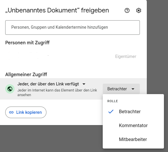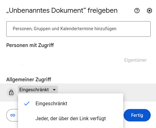 Wählen Sie unter „allgemeiner Zugriff“ die Option „Jeder, der über den Link verfügt“.