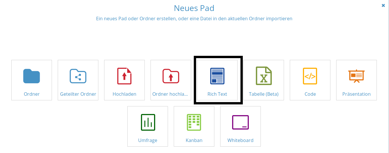 Im nächsten Schritt können Sie die Art des gewünschten Dokuments auswählen - für Text eignet sich ein „Rich Text“-Dokument: