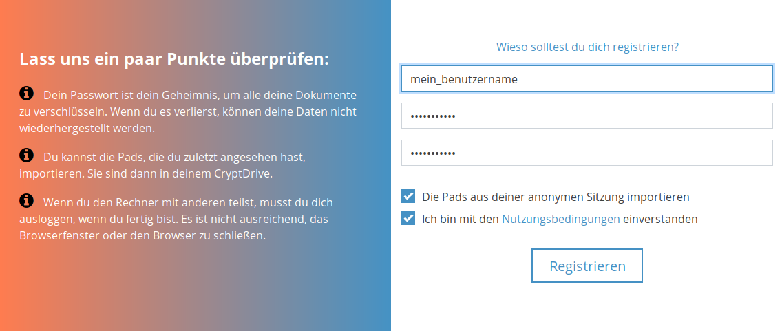 Cryptpad verarbeitet keine personenbezogenen Daten - also auch keine E-Mailadresse. Notieren Sie sich daher Ihre Eingaben im anschließenden Formular. Sie können bei Cryptpad nicht wie bei anderen Diensten Ihr Passwort über die E-Mailadresse wiederherstellen!