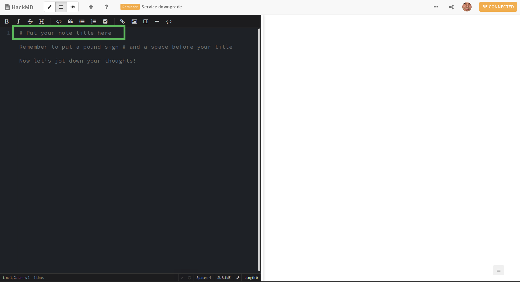 Damit das Dokument einen Namen erhält, müssen Sie ihm einen Titel geben (hinter dem ersten „#“):